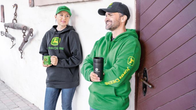 Sweat à capuche en polaire vert John Deere avec logo de marque commerciale sérigraphié sur la manche. Composition : 60 % coton, 40 % polyester