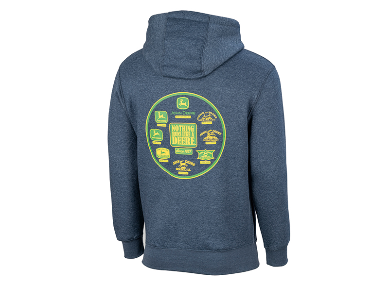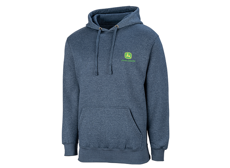Sweat à capuche John Deere en polaire bleu marine avec sérigraphie du logo de la marque sur la poitrine gauche et logo de la chronologie de l’horloge au centre du dos. Composition : 60 % COTON, 40 % POLYESTER TRICOTÉ