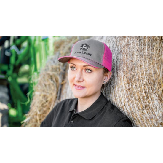 Casquette avec arrière en filet grise / rose vif John Deere, logo brodé et fermeture à boutons-pression ajustable. Composition : Avant: 100 %Coton Arrière: Filet 100 % Polyester