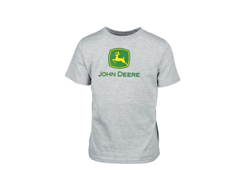T-shirt pour jeunes gris John Deere avec logo de marque commerciale sérigraphié sur l'avant. Composition : 60 % coton, 40 % polyester