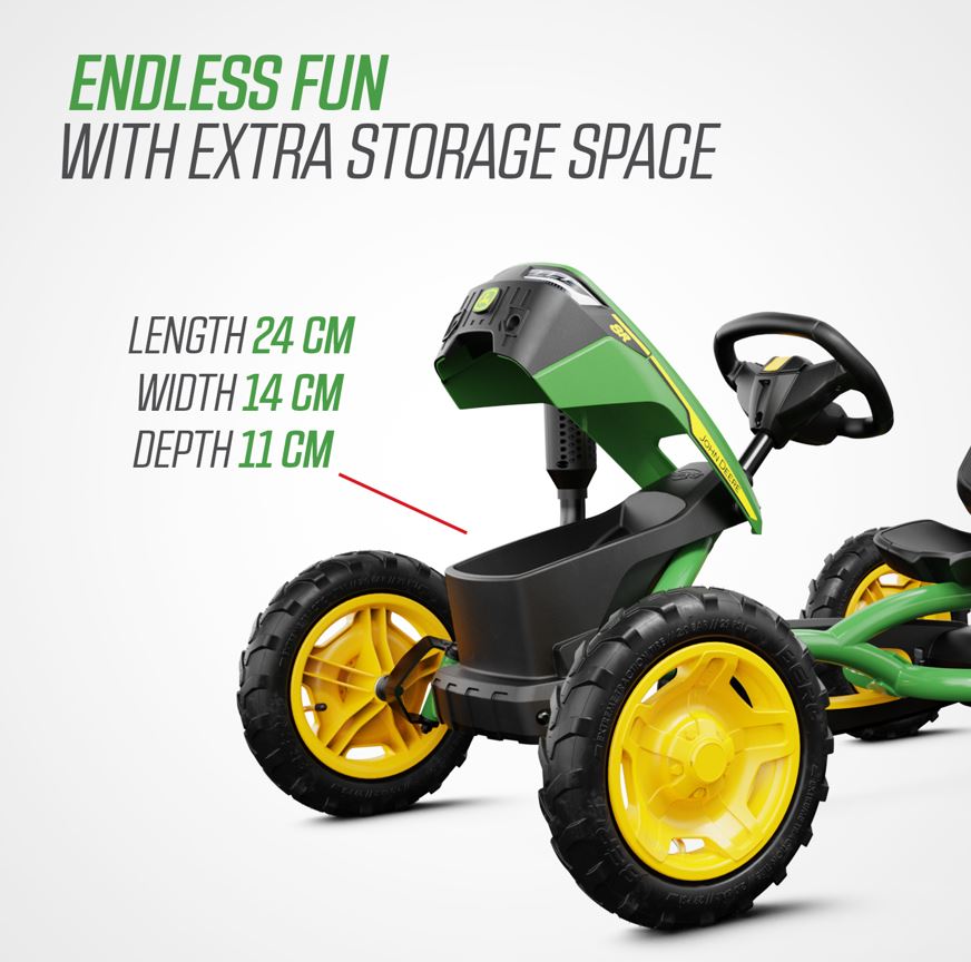 Le kart à pédales BERG Buddy John Deere est destiné aux enfants âgés de 3 à 8 ans et dispose d’un siège réglable afin de s’adapter à la croissance de l’enfant et de l’accompagner longtemps.