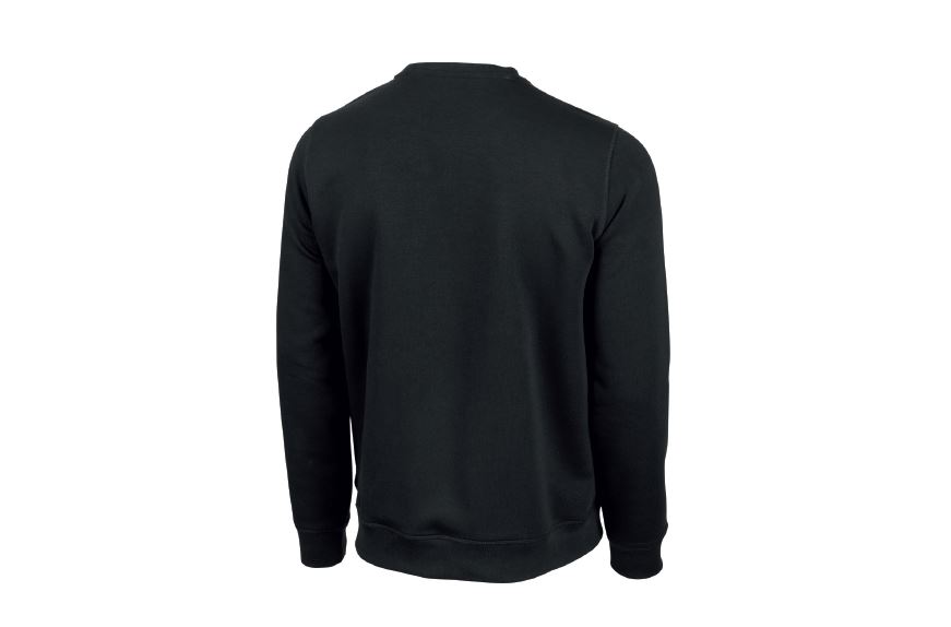 Vue de dos d’un sweat-shirt noir uni à manches longues et à col ras du cou, avec poignets et ourlet côtelés.