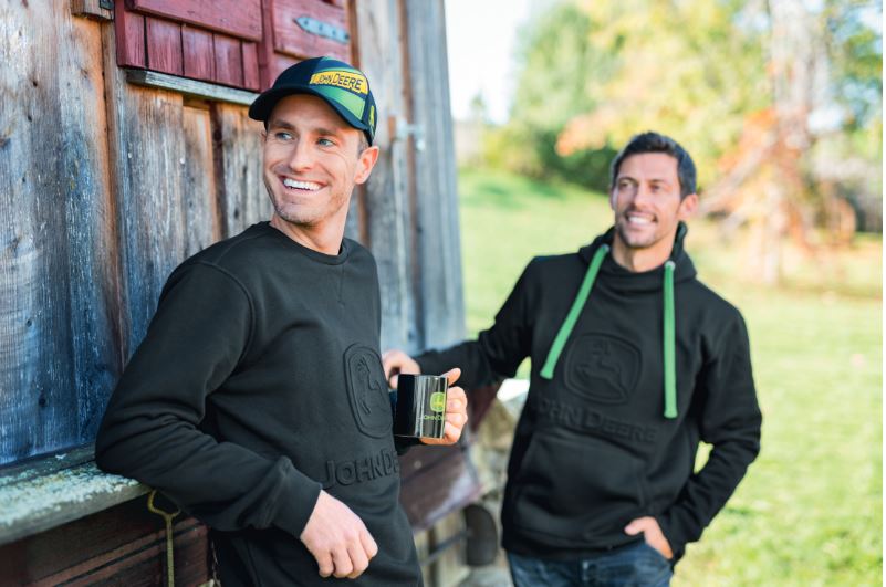 Deux hommes portent des vêtements John Deere : l’un avec un sweat-shirt noir à col rond et une casquette, l’autre avec un sweat à capuche noir et des cordons verts.