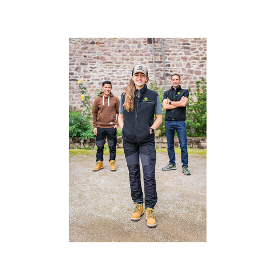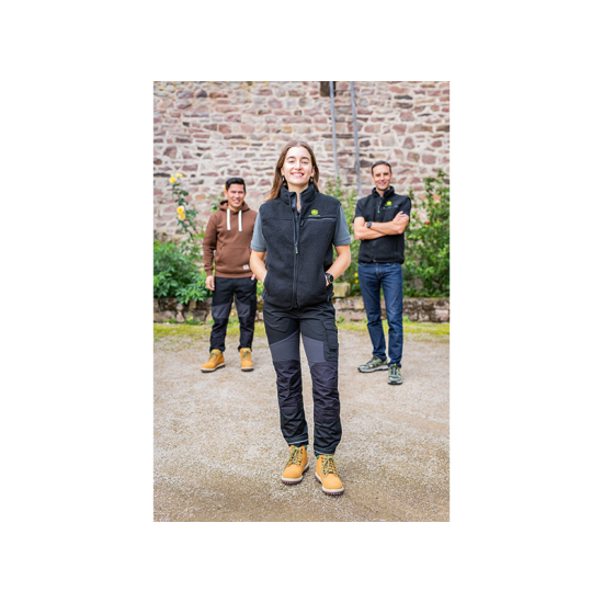 Veste en polaire confortable, épaisse et chaude. Intérieur gratté doux. Deux poches sur la poitrine et deux poches latérales à fermeture éclair. Réglage de la taille par cordon élastique. Détails contrastés et coutures en surjets verts. Composition : 100 % polyester.