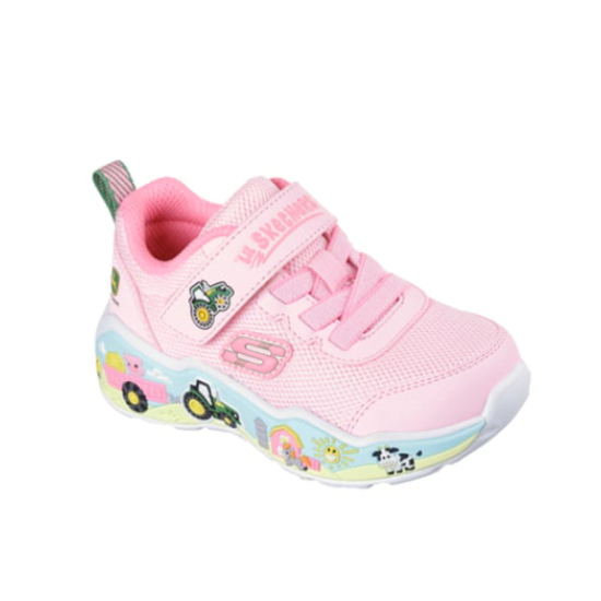Ce modèle à fermeture adaptative de Skechers présente une tige en maillage et synthétique avec des lacets extensibles fixes, une sangle réglable sur le cou-de-pied et une semelle intermédiaire matelassée avec des graphismes amusants sur le thème de la ferme.
