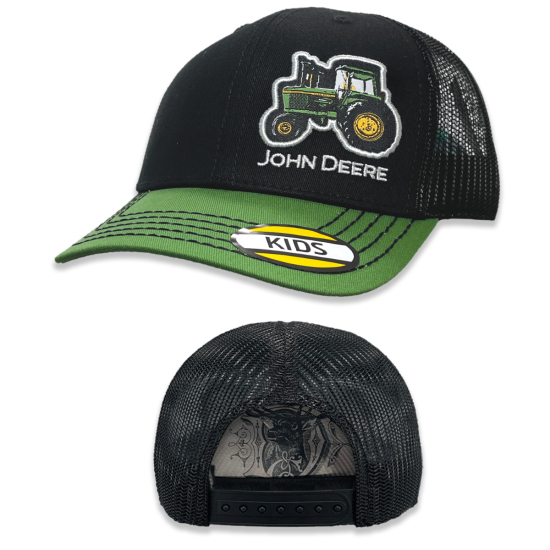 Capellino per bambini John Deere verde e nero, con toppa con trattore sulla parte anteriore. Materiale: Parte anteriore: 100% cotone Parte posteriore: rete 100% poliestere.