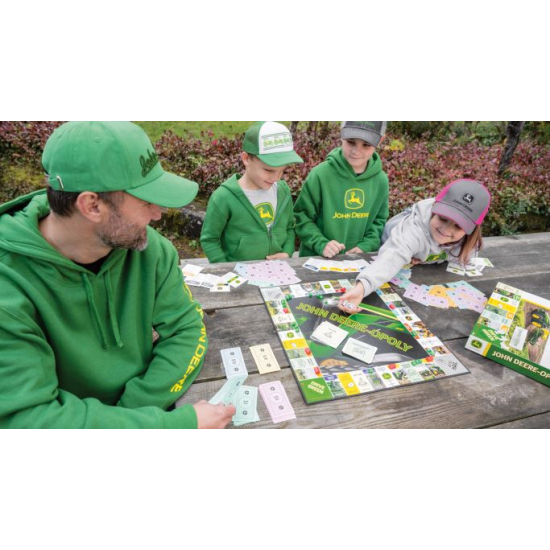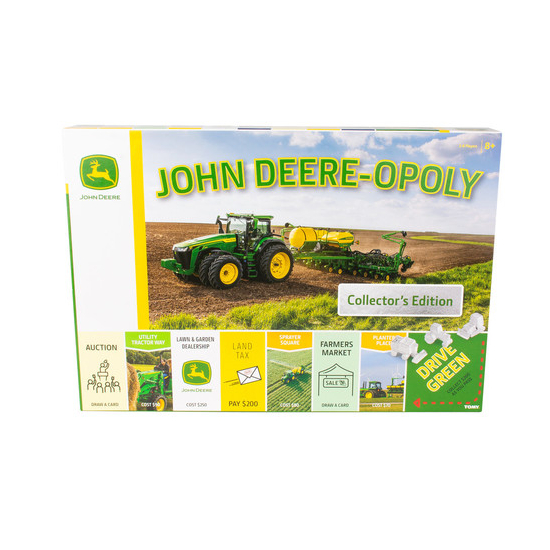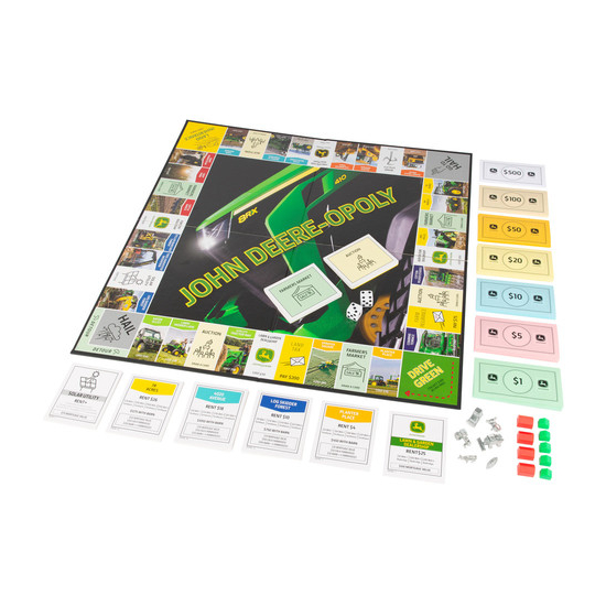 Tutto il divertimento dell'agricoltura in un classico gioco in stile monopoli: quest'edizione da collezione include numerose proprietà da acquistare: da Piazza Seminatrice a Terrazza Mietitrebbia e molti altri. Aggiungeteci fattorie o, ancora meglio, granai per ottenere ancora più affitto dagli avversari. Potete partecipare al mercatino degli agricoltori e alle aste, sperando di estrarre una carta fortunata o tirare il dado e atterrare su un Terreno ereditato, l'appezzamento che può aiutare tutti ad arricchirsi più in fretta. E non dimenticate di ritirare € 200 quando passate dal via! Questo set autorizzato ufficialmente è dotato di attrezzatura John Deere e tanti altri accessori divertenti per l'agricoltura. Assicuratevi solo di non essere spediti in mezzo alla "Grandine". Tra le pedine a tema agricoltura ci sono trattore, mietitrebbia, apripista cingolato, pannocchia, maiale e una mucca. Gioco prodotto negli Stati Uniti.
