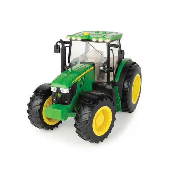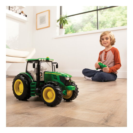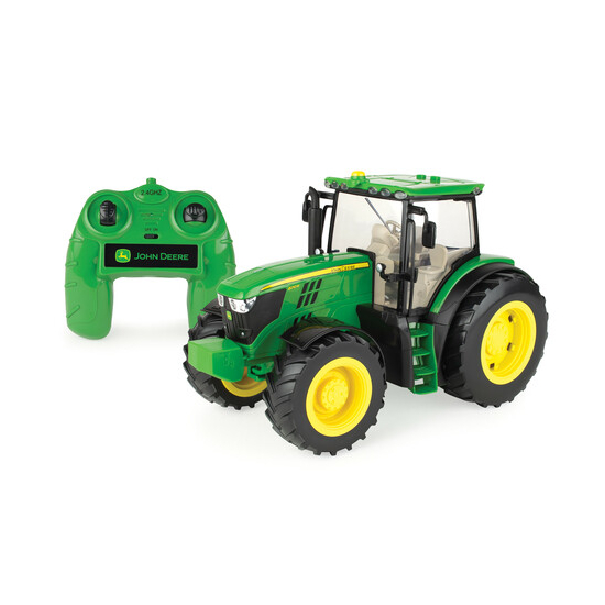 Questo trattore John Deere 6210R in scala 1:16, con comando remoto, è dotato di suoni e luci realistici, un sollevatore posteriore regolabile, compatibile con quasi tutti gli accessori in scala 1:16 e una cabina con lunotto aperto per un facile accesso all’interno. Le funzioni con comando remoto includono la marcia avanti, la retromarcia e la sterzata a destra e a sinistra. Ideale dagli 8 anni in su. Richiede quattro batterie AA e una batteria da 9 V. Adatto per giocare al chiuso e all'aria aperta, per bambini e bambine di età superiore a 8 anni.