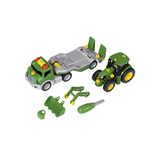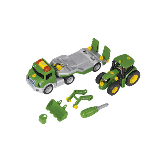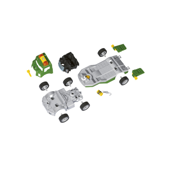 Costruisci il tuo trattore 6215R John Deere in scala 1:24 circa, montando sul telaio gli pneumatici, il sedile, la cabina e il cofano. Assembla la tua unità di trasporto, fissando il telaio alla cabina e le ruote al semirimorchio. Attacca il trattore all'unità di trasporto grazie al verricello. Attiva luci e suoni. Compatibile con tutte le costruzioni prodotte per John Deere da KLEIN. Per bambini di età superiore a 3 anni.
