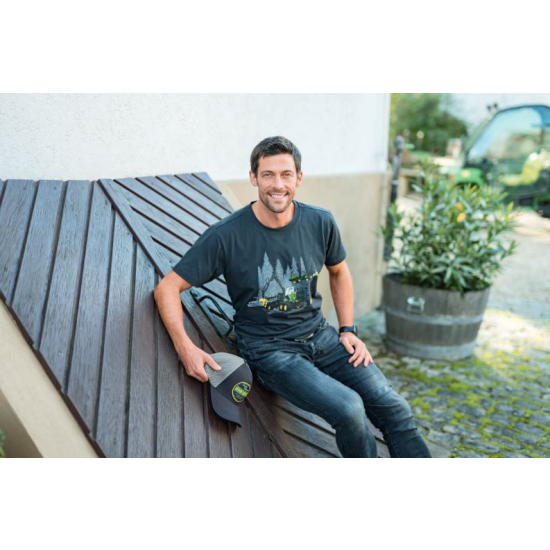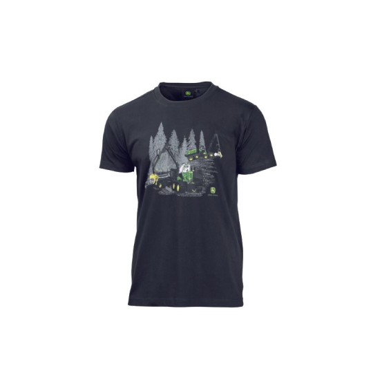 T-shirt girocollo antracite con disegno di macchine per silvicoltura stampato davanti e logo John Deere. Realizzata in morbido jersey di cotone. Materiale: 100% cotone. Sostituzione di MCL2019030.