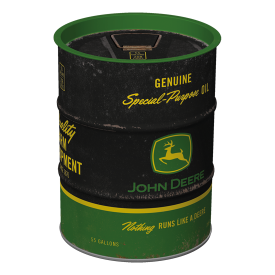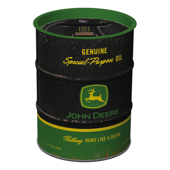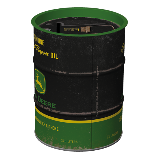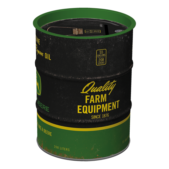 Salvadanaio a forma di barile d’olio “John Deere - Special-Purpose Oil” nero. Il design del salvadanaio a forma di barile d’olio si distingue per la straordinaria attenzione ai dettagli. Le decorazioni stampate su tutta la superficie del salvadanaio non potranno fare a meno di attirare l’attenzione. Questo straordinario prodotto delle dimensioni di 11,7 x 9,3 cm in lamiera d’acciaio è dotato di rivestimento protettivo opaco, coperchio rimovibile con fessura e capacità di 0,6 litri.