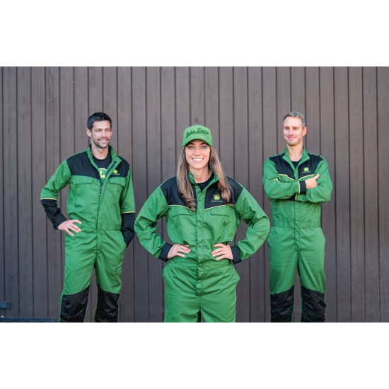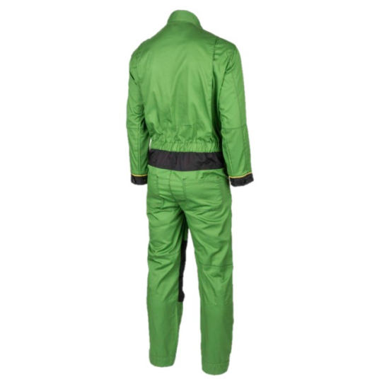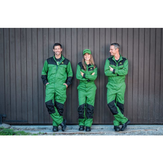 Tuta John Deere classica con apertura a bottoni sulla parte anteriore. Due tasche sul petto con risvolti. Tasche laterali alla francese e tasche posteriori a toppa. Pratica tasca con risvolto sulla coscia. Vita elasticizzata per un maggiore comfort. Tasche sulle ginocchiere e orlo estensibile di +5 cm. Materiale: 65% poliestere, 35% cotone