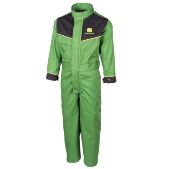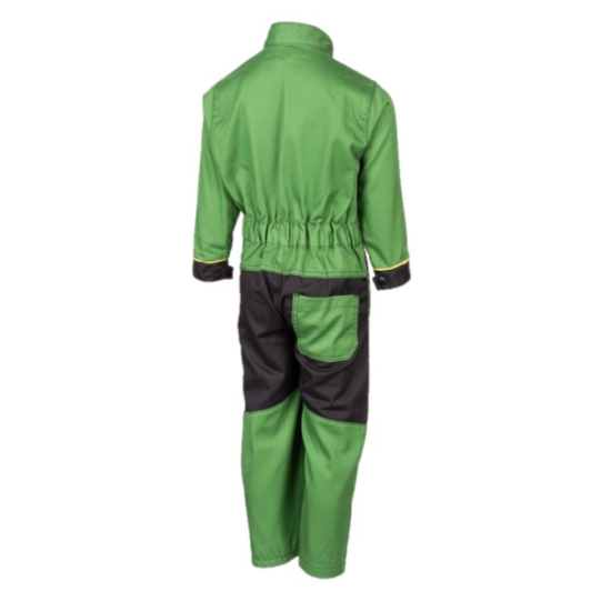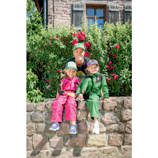Tuta per bambini John Deere classica con apertura a zip sulla parte anteriore, tasca con risvolto sul petto, due tasche laterali alla francese e una tasca posteriore. Vita elasticizzata. Bordature gialle a contrasto per il classico look John Deere. Fessino regolabile con bottoni automatici. Materiale: Materiale: 65% poliestere, 35% cotone
