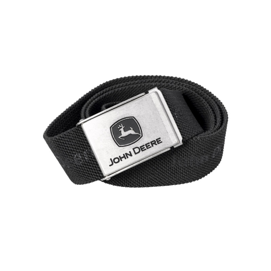 Cinghia ergonomica con fibbia metallica in rilievo. John Deere stampato tono su tono sull'intera cinghia. Mix robusto, elastico e comodo di 71% poliestere e 29% gomma naturale. Lunghezza: 120 cm.