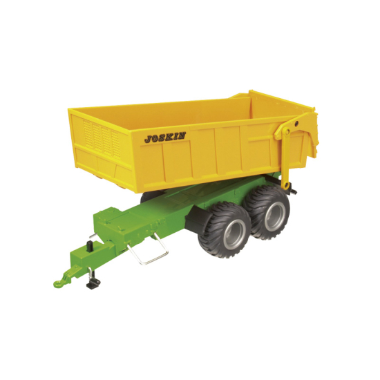 Fedele riproduzione dell’originale. Rimorchio a doppio assale con barra di traino e piastra centrale orientabile che consente il ribaltamento elettronico del rimorchio verso destra e verso sinistra. Eccellente funzione di ribaltamento, potente servomotore. Protezione del servomotore mediante speciali attacchi di sicurezza miniaturizzati. Luci posteriori e indicatori a LED. Rimorchio collegato al trattore mediante cavo.
