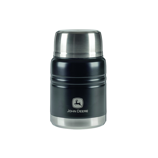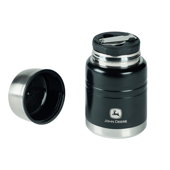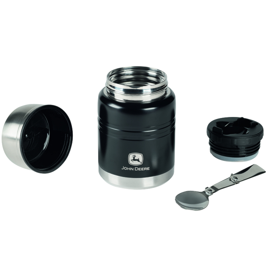 Contenitore termico per alimenti (fino a 550 ml), realizzato in acciaio inossidabile con doppio strato di isolamento. Include un cucchiaio pieghevole, alloggiato nel coperchio. Il logo John Deere è inciso a laser nella parte anteriore.